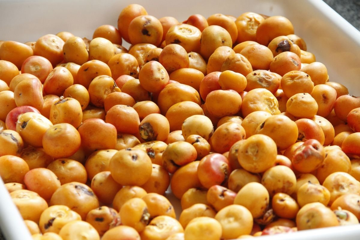 Fruto de uma palmeira nativa da região. Usado em licores, doces e conservas. Tem sabor ácido e aromático. Presente em festas e produtos locais. Representa a flora típica da região.